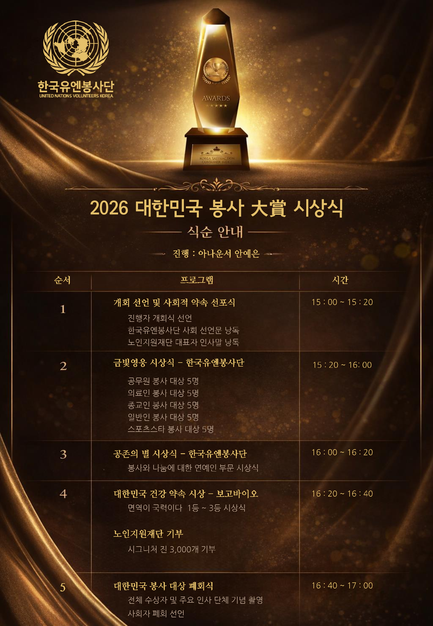 4. 「2026 상반기 대한민국 봉사 大賞 시상식」은 대한민국 곳곳에 숨겨진 금빛영웅을 발굴하여, 오랜 시간 나눔과 봉사의 가치를 실천해 온 분들의 숭고한 정신을 널리 알리고] 그 헌신을 대한민국 사회의 소중한 자산으로 기록하고자 마련된 자리입니다.