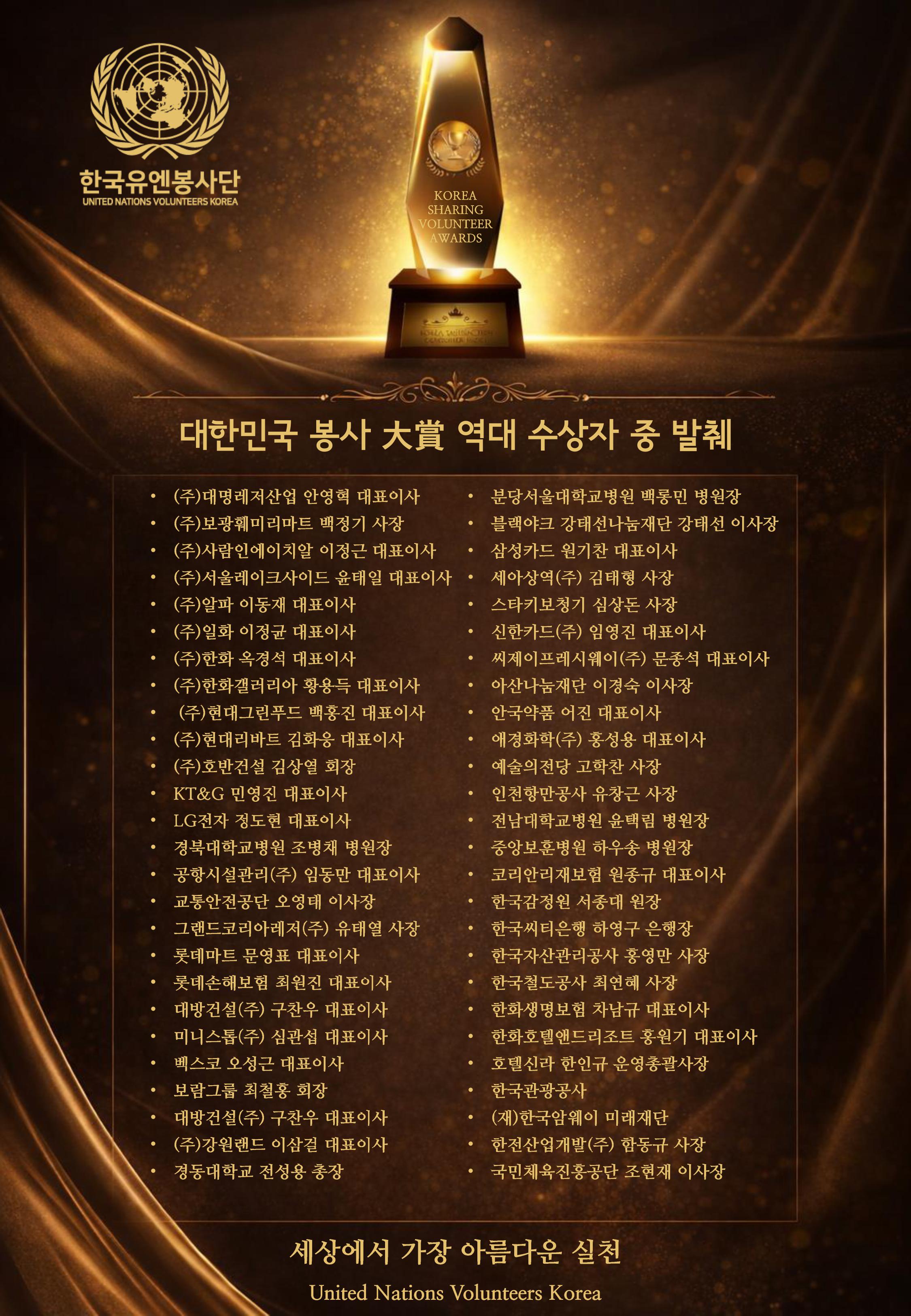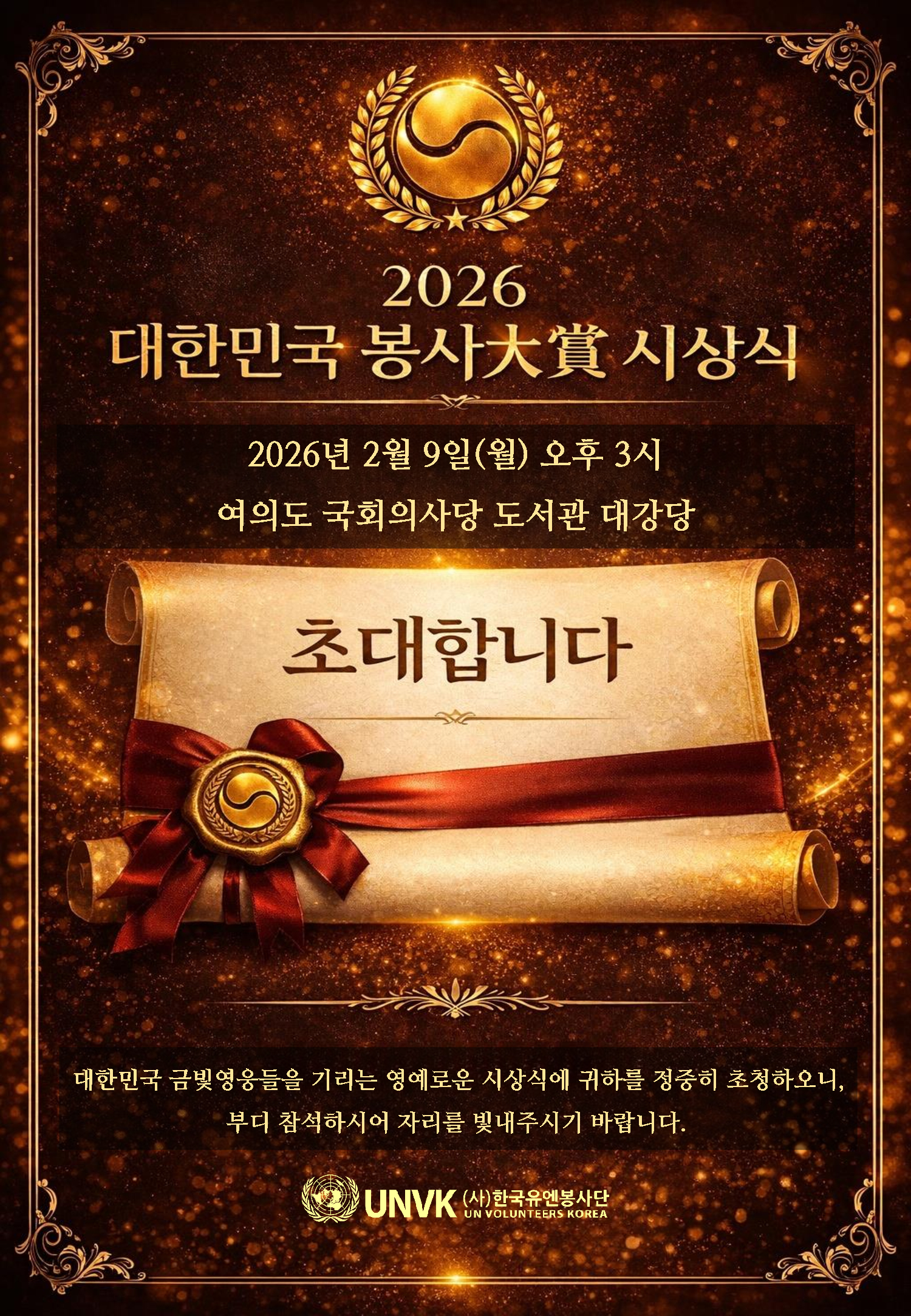 이에 개인의 명예를 넘어 공동체를 위해 묵묵히 헌신해 온 봉사자들을 공식적으로 조명하고, 그들의 나눔과 봉사 정신을 국가의 이름으로 시상함으로써 진정한 감사와 깊은 존경의 마음을 전하고자 하오니, 부디 행사에 참석하시어 자리를 빛내주시길 바랍니다.